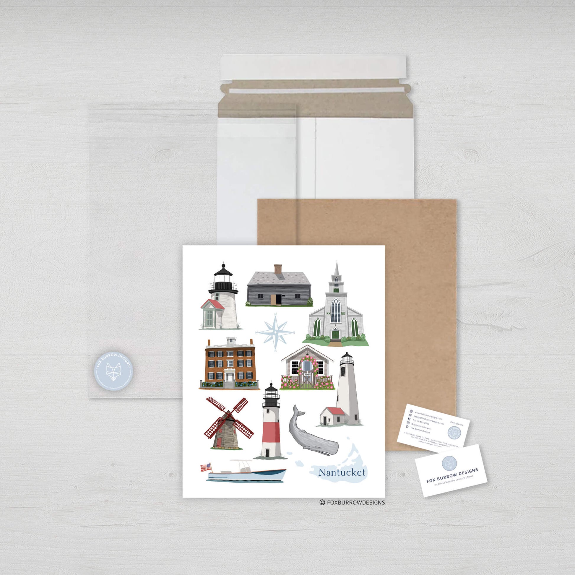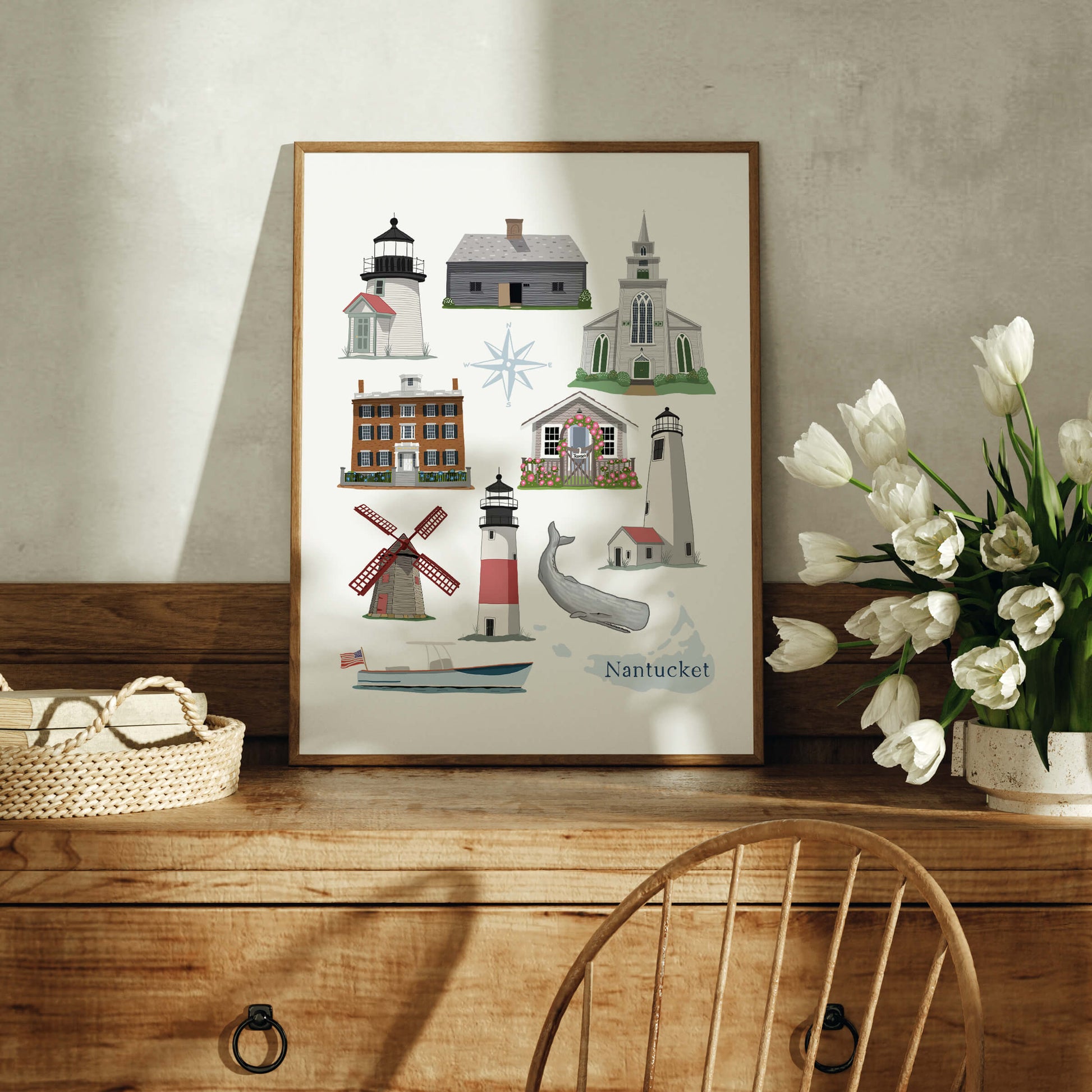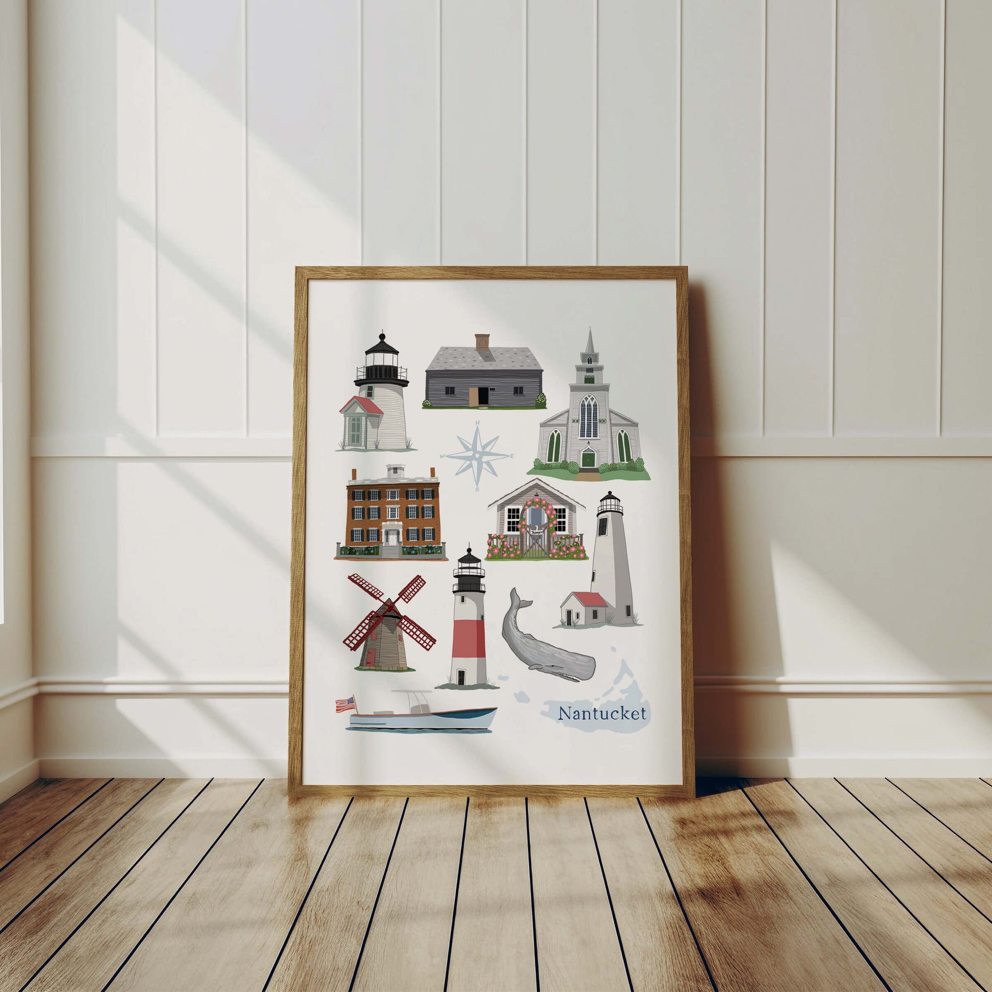 Hydrangeas, lighthouses and historic landmarks are what Nantucket is all about! This poster celebrates local coastal landmarks around Nantucket, Massachusetts.