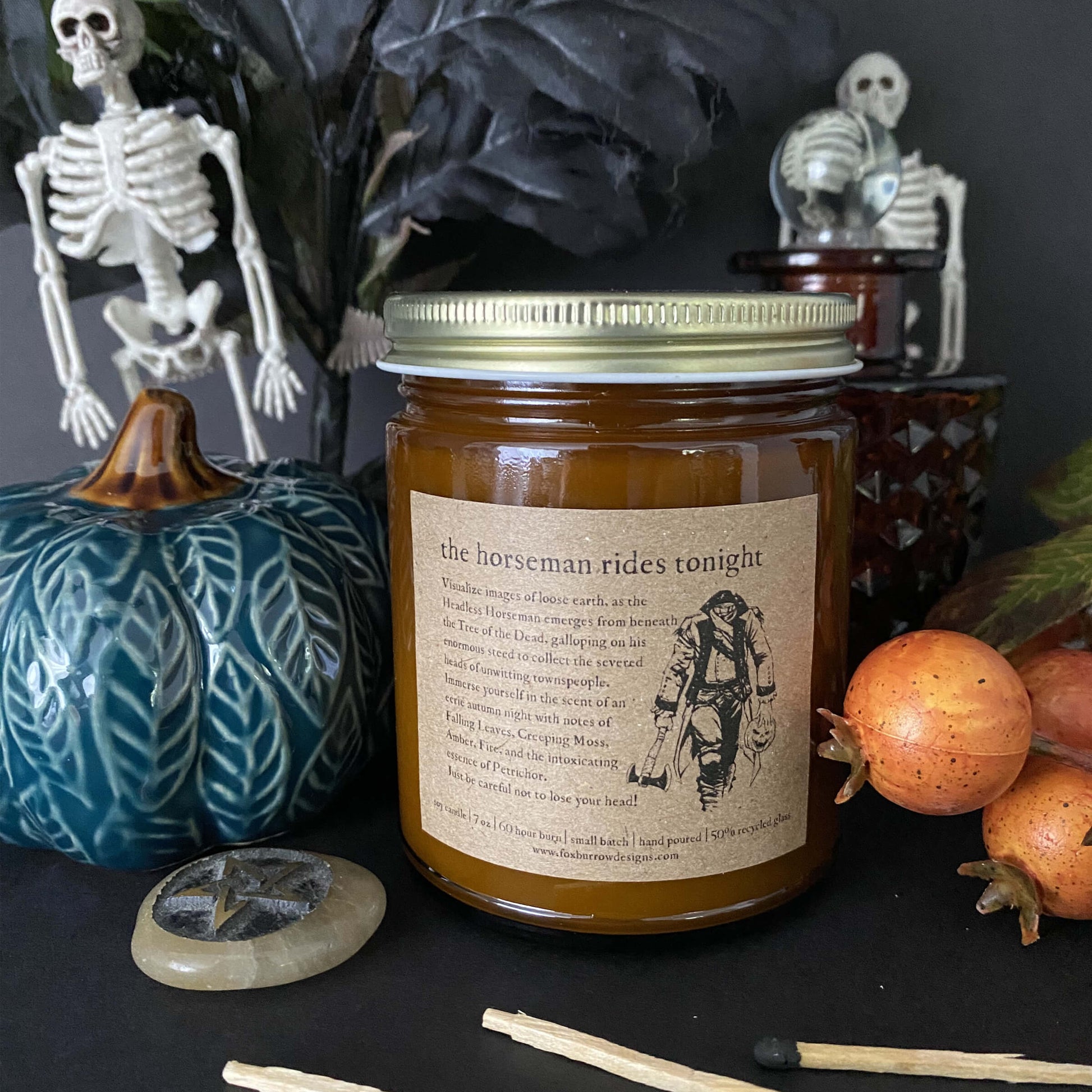Visualize images of loose earth, as the Headless Horseman emerges from beneath the Tree of the Dead, galloping on his enormous steed to collect the severed heads of unwitting townspeople. Immerse yourself in the scent of an eerie autumn night with notes of Falling Leaves, Creeping Moss, Amber, Fire, and the intoxicating essence of Petrichor. Just be careful not to lose your head!